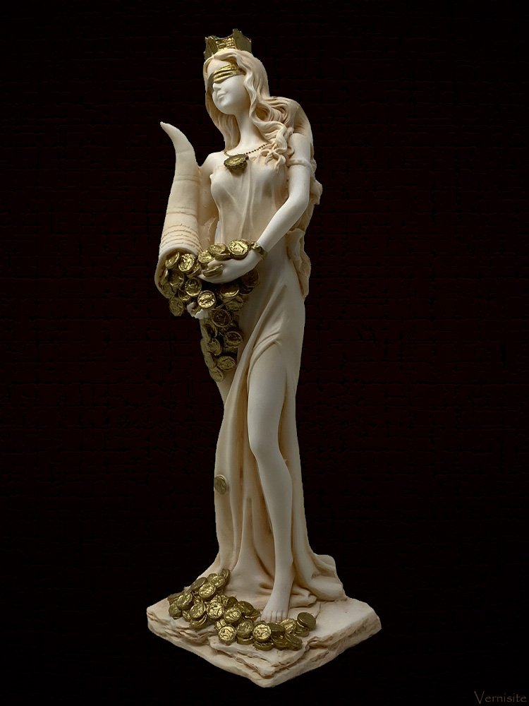 Fortuna’s Roman counterpart, Tyche, was the goddess or spirit of fortune, chance, providence, and fate. She was usually honored as Eutykhia, the goddess of good fortune, luck, success, and prosperity.Â